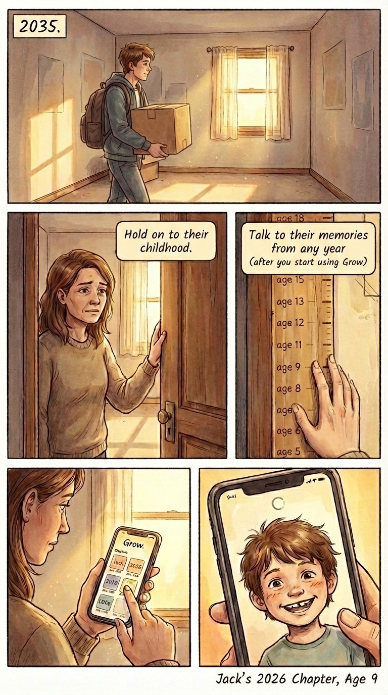 From calls, messages, and media each year (strict access controls), Grow creates your Chapter starting from 2026. Voice, face, quotes.