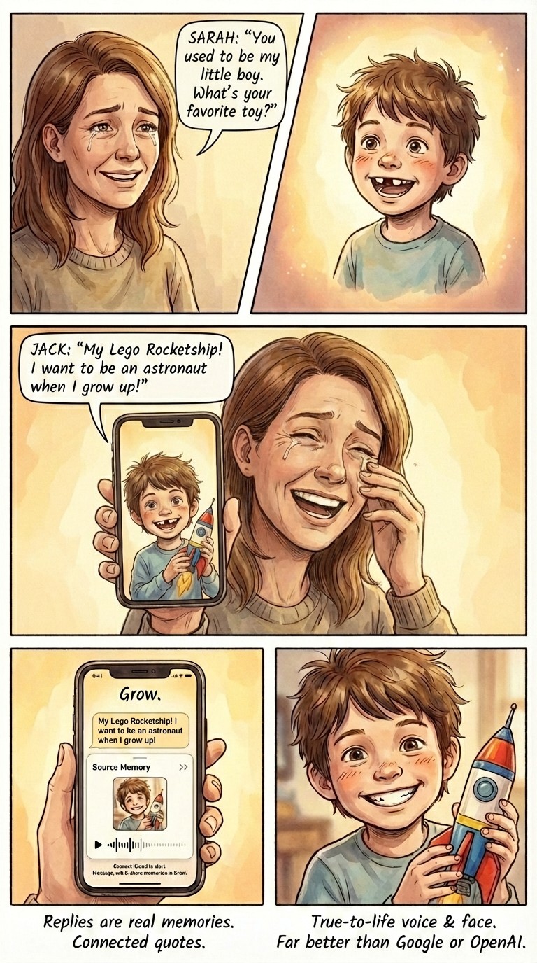 Grow is a better WhatsApp for families, connecting made easier. All while saved calls preserve your yearly voice & appearance — travel back to any year, talk to loved ones' memories forever. Real quotes. Consent-first.