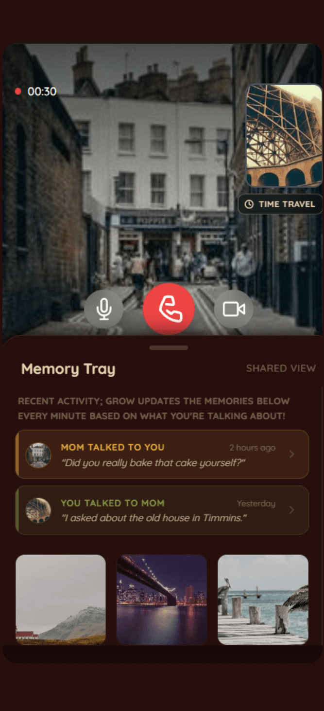 1) Grow Calls: Calls with Loved Ones (not just once or twice with a nurse) discussing memories on screen (see recent memories, then every minute Grow retrieves relevant memories) and presonalized cognitive prompts.