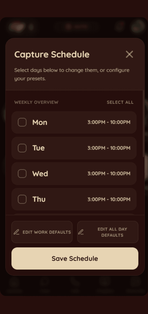 Background Capture (sound around photos & Save it Grow) is activated on a schedule you set every week (like 5pm to 10pm on workdays), and you can manually turn it on or off (stays activated for 24 hrs).