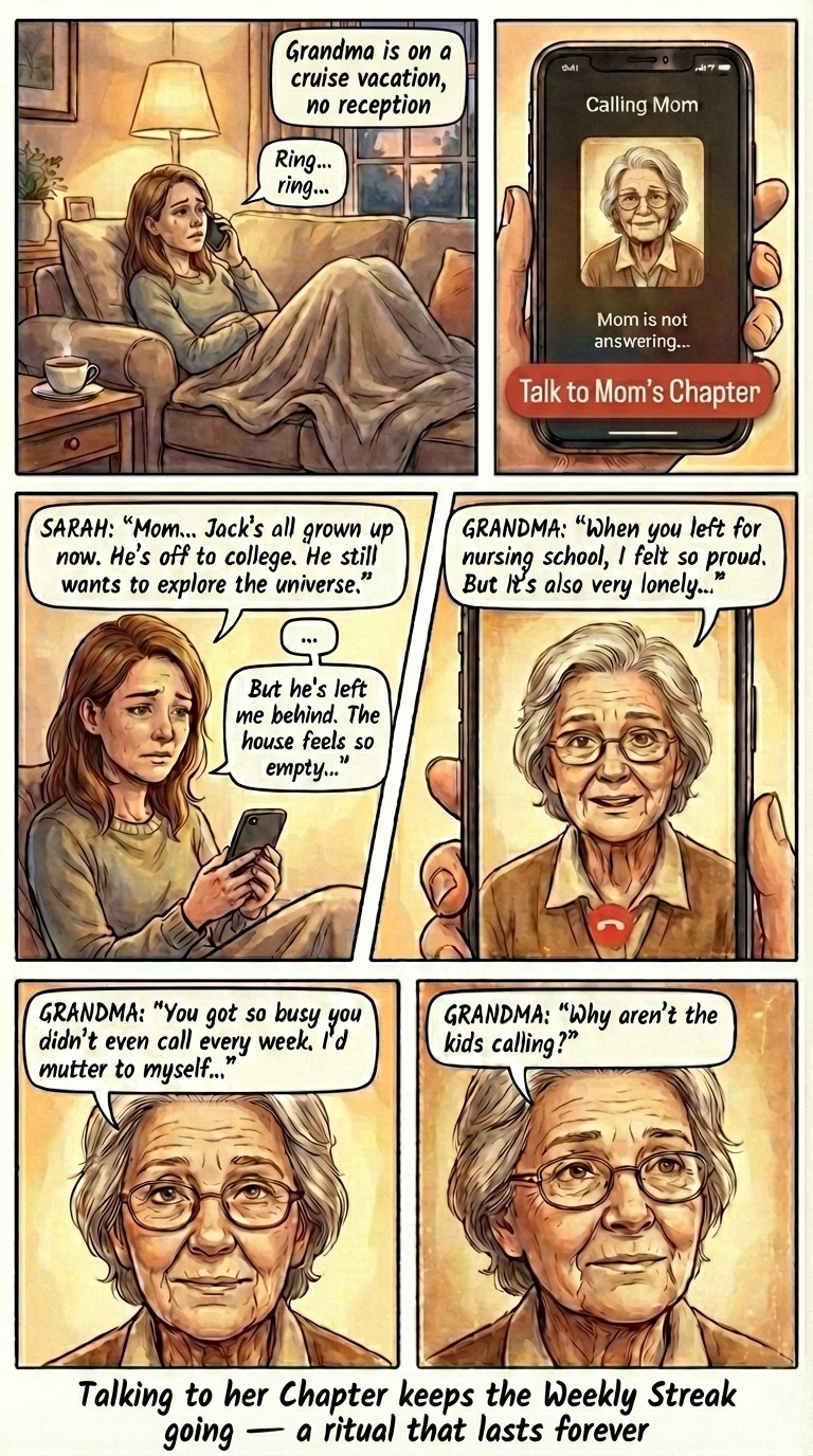 When you find Mom's memories in the future, it's not a made up 'friend' nor a perfect time machine, but better: the 📖stories & 💖love she chose to share with you - intentional legacy respecting privacy & boundaries. Her voice & face are from video calls she chose to save.