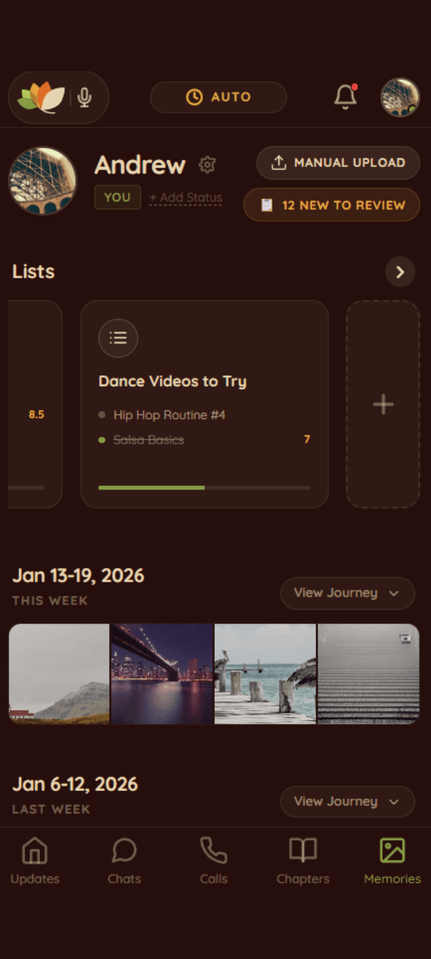 🕰️ Travel Back To the Laughter & Whispers that Defined Them. Ask your chapter easily about Who What When Where, or vaguely "did I ever watch Home Alone with Grandpa?" Or "Remember when Mom puked in the car?" 📋 Grow auto-creates Lists: food rankings (photos of food that you can rate out of 10), or dance videos to try (links). You can manually add to them. Memes. Receipts. Recipes. Thoughts on Philosophy.