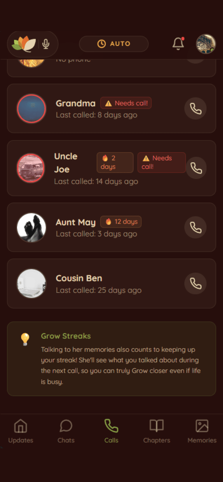 🔥Streaks Let Grandma Receive More Calls, And These Calls Improve Cognitive Decline: Kids don't call for weeks. Worse when seniors can't age in place (only 1/4 have family who regularly visit). Grow reminds you to keep up your weekly streak, and calls show recent memories akin to Reminiscence Therapy (proven to significantly improve cognitive decline).