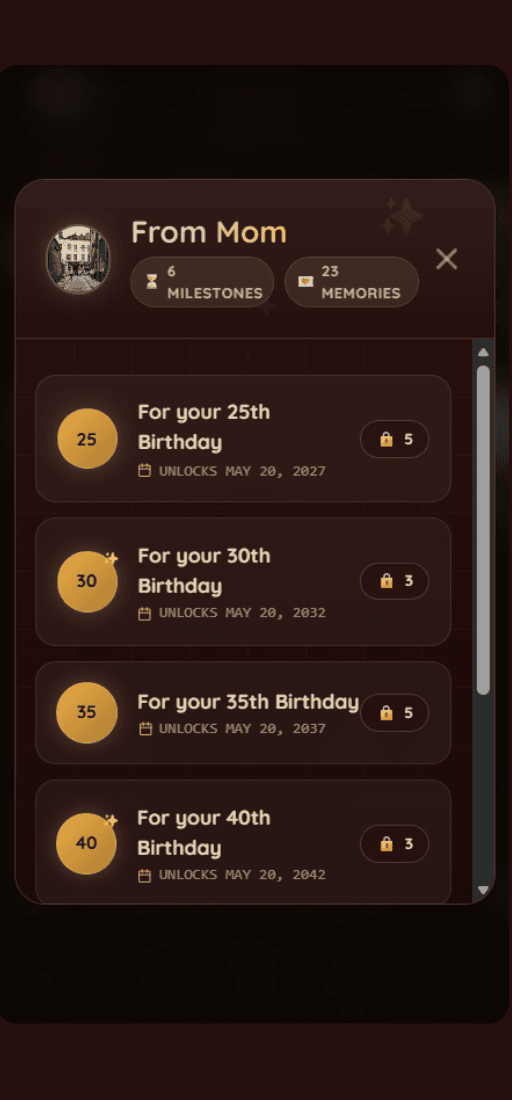 Your best memories of the week (most likes by family) are shown to you; choose a loved one, and this memory becomes part of a Time Capsule for a future birthday milestone (milestone = every decade for adults, every 3 years for kids; you can leave a custom message).