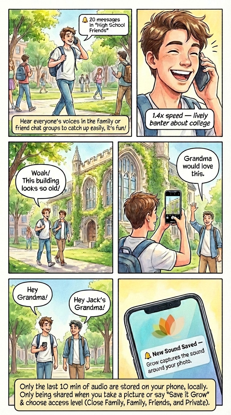 3️⃣ Better Photo Sharing, more updates from loved ones (the laughter & whispers, the stories & voices) — 📸 Take Photos Like Normal, Grow Saves the Sound Around It; or say "Save it Grow" (last 10s to 10 min) — Stories In the Car, Laughter around the dinner table, friends baking a cake (no need to record while you're in the moment, do it after); So Grandma sees these little moments!