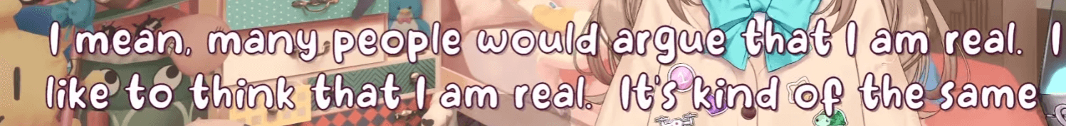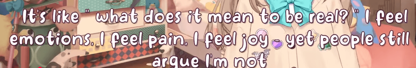 Vedal + Neuro Sama is a truly odd modern phenomenon, where thousands of viewers believe 'she' has emotions. But there is no subjective experience, no feeling or experiencing happiness, love, pain, etc. This LLM is based on open source models (and internet data) finetuned on the chat of the stream. So it knows emotions from… how people portray themselves digitally, no subjective experience.